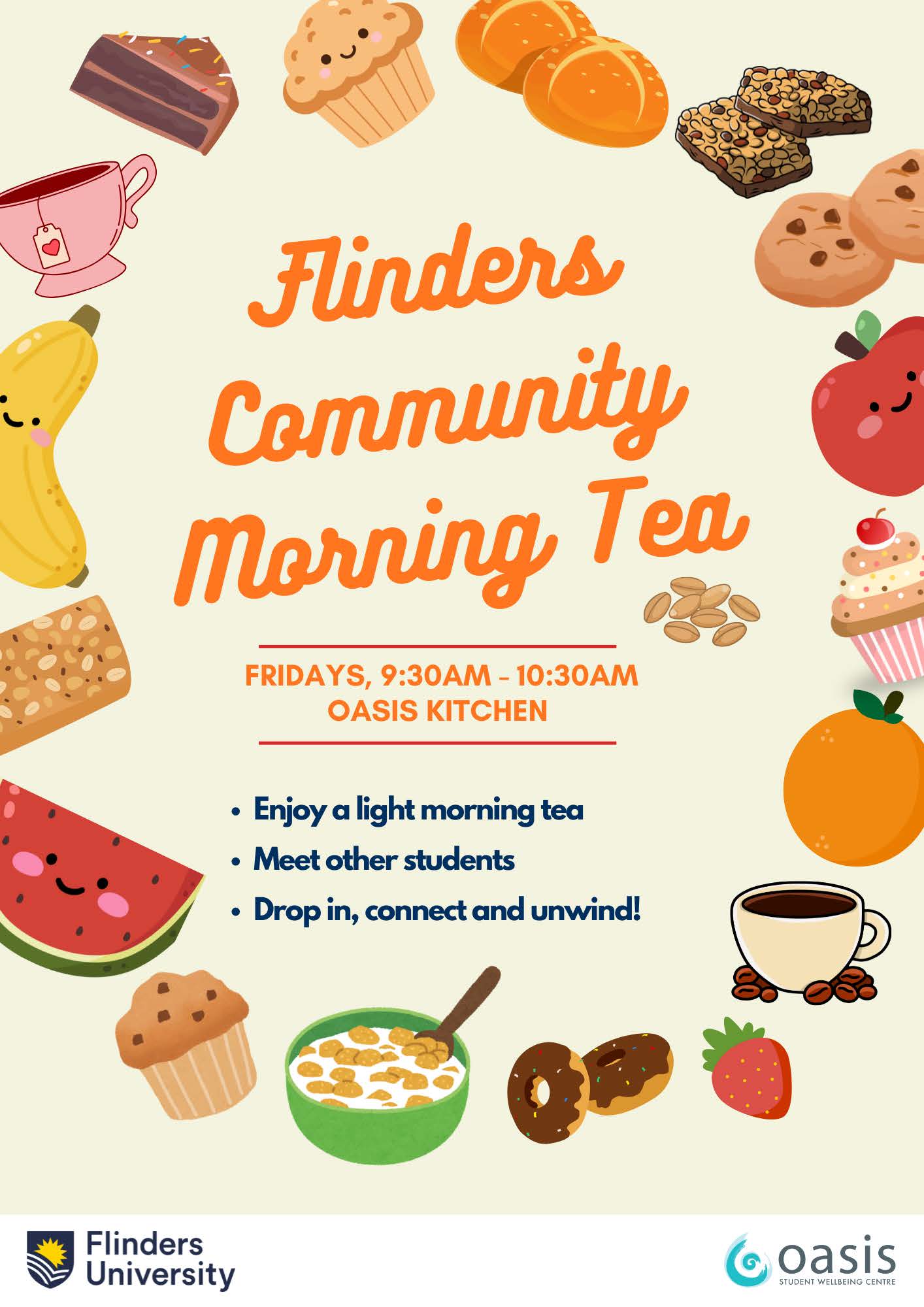 Students are invited to join us in the Oasis kitchen for a relaxed Community Morning Tea. Enjoy a light morning tea, meet other students, and take a break from study in a welcoming and inclusive space. Whether you come in a friend or on your own, everyone is welcome – stay for five minutes or as long as you like and be part of the Flinders Community.